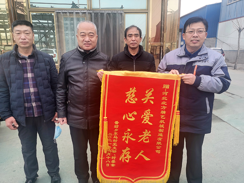 ? ? ? ? 近日,香坊鄉東馬村村長及黨支部書記等一行三人將書有“關愛老人,慈心永存”的錦旗送至河北北方精藝機械制造有限公司總經理馬風順先生手中,以表達該村村民對北方精藝愛心捐物的善舉表示感激之情。